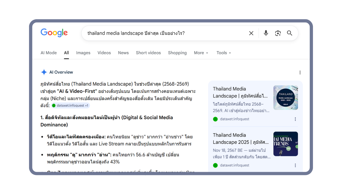 การเข้ามาของ AI ทำให้พฤติกรรมการค้นหาข้อมูลผ่าน Google ของผู้คนเปลี่ยนไปอย่างชัดเจน จากการค้นหาด้วยคีย์เวิร์ดสั้น ๆ และคลิกเว็บไซต์ที่แสดงผลอันดับแรก ปัจจุบันนี้ผู้ใช้งานบางส่วนสามารถพิมพ์คำถามลงในช่องค้นหา แล้ว AI จะสรุปคำตอบให้ทันทีผ่าน AI Overview หนึ่งในฟีเจอร์จาก Google ที่สรุปคำตอบจากหลายเว็บไซต์มาแสดงเป็นเนื้อหาด้านบนสุดของหน้าผลการค้นหา ทำให้ผู้ใช้งานอินเทอร์เน็ตไม่ต้องคลิก ไม่ต้องเลื่อนอ่านหลายเว็บไซต์ หรือไม่ต้องเปรียบเทียบเอง พฤติกรรมนี้ถูกเรียกว่า “Zero-Click Search” ค้นแต่ไม่คลิก