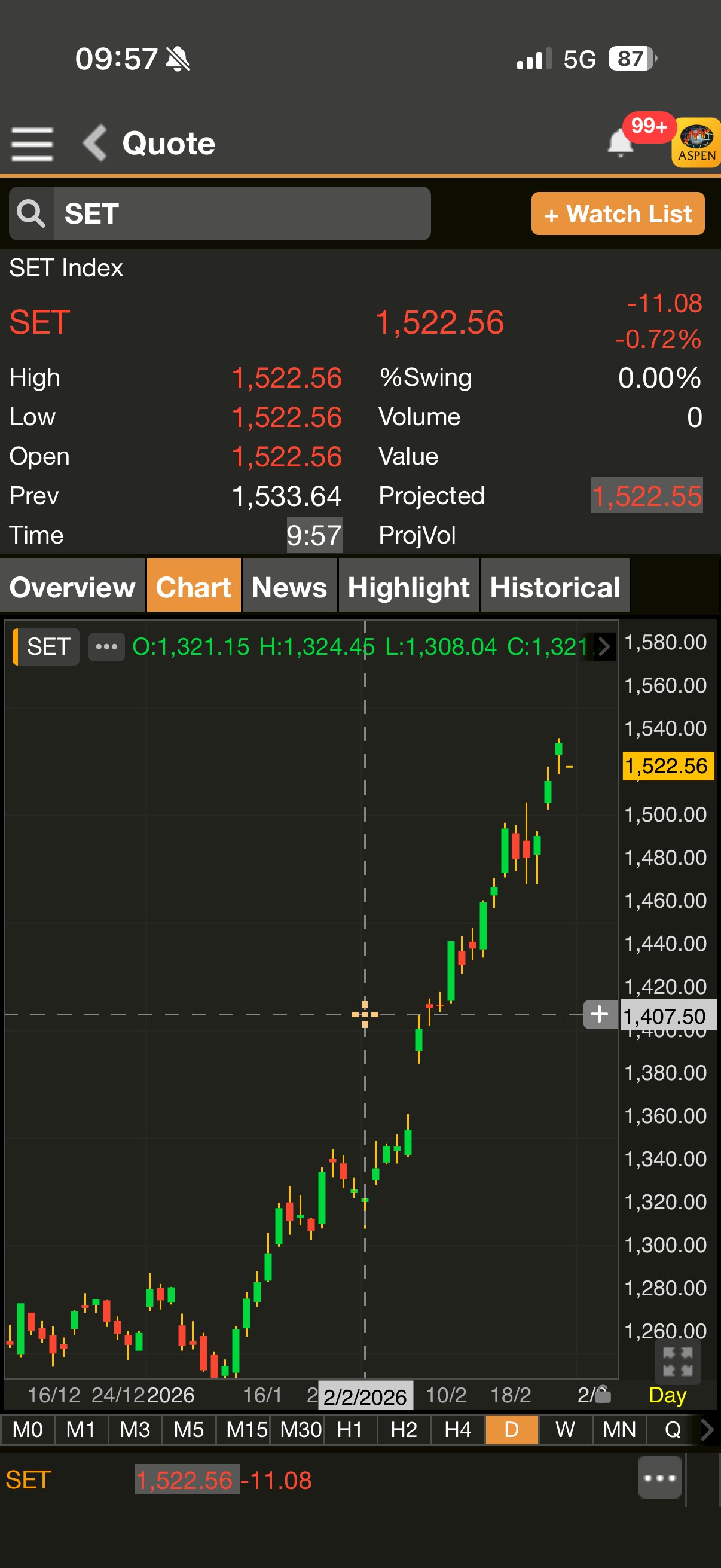 เมื่อเวลา 9.57 น. ดัชนี SET มาอยู่ที่ 1,522.56 จุด ลดลง 11.08 จุด (-0.72%)