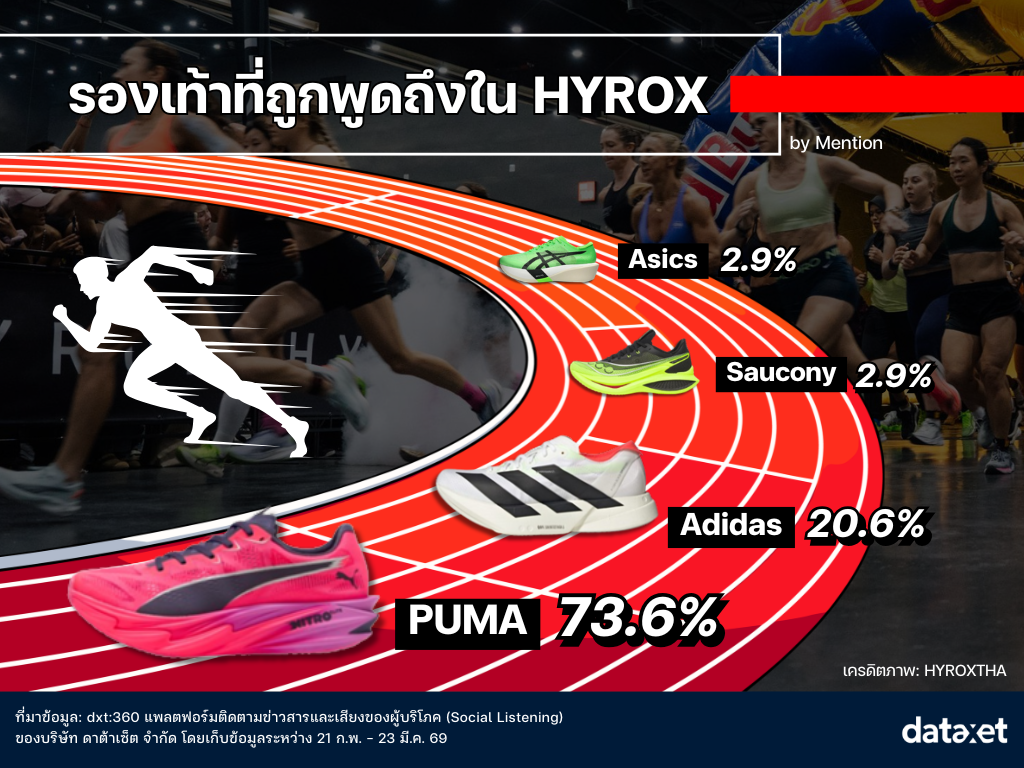 - PUMA (73.6%): PUMA ถูกพูดถึงมากที่สุด โดยส่วนหนึ่งมาจากบทบาทในฐานะ Global Partner ของงาน ทำให้ครองพื้นที่สื่อไปถึง 73.6% โดยรุ่น PUMA x HYROX Deviate NITRO™ Elite 4 ก็ได้รับการพูดถึงและรีวิวอย่างต่อเนื่องในฐานะรองเท้าที่ผลิตมาสำหรับการแข่งขันประเภทนี้โดยเฉพาะ