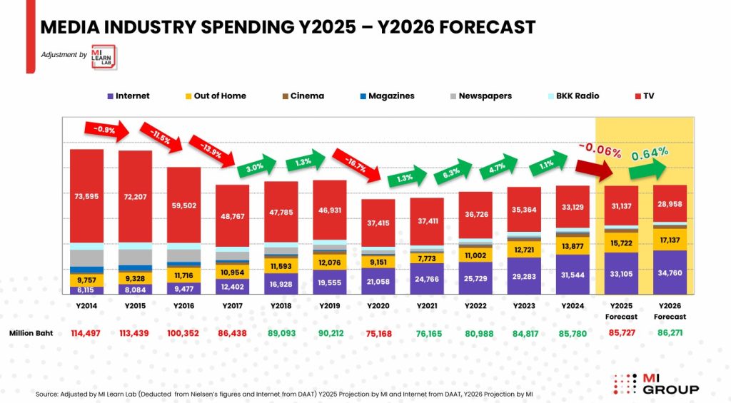 โดยข้อมูลล่าสุดจาก Media Intelligence Group (MI GROUP) ระบุว่า ช่วง 11 เดือนแรกของปี 2568 (ม.ค.-พ.ย.) เม็ดเงินโฆษณาทีวีลดลง 6% เมื่อเทียบกับปีก่อน อันเป็นผลมาจากปัจจัยลบช่วงปลายปี เช่น สถานการณ์น้ำท่วมและกำลังซื้อที่ซบเซา