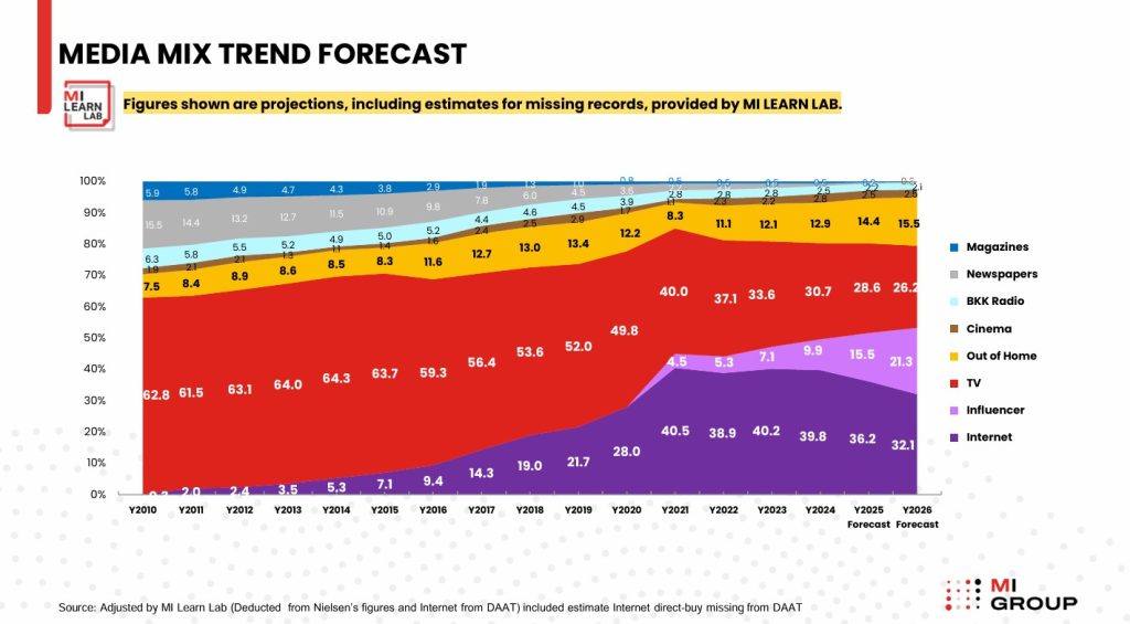 แต่เมื่อดูเม็ดเงินที่แท้จริงด้วยการนำงบโฆษณาส่วนที่ไม่ถูกรายงานในระบบ (Non-Reported Figures) ซึ่งเป็นงบก้อนโตที่แบรนด์จ่ายตรงให้กับอินฟลูเอนเซอร์และแพลตฟอร์มออนไลน์มารวมคำนวณด้วย ภาพจะเปลี่ยนไปทันที เพราะฐานเม็ดเงินรวมที่ใหญ่ขึ้นจะดึงให้สัดส่วนที่แท้จริงของสื่อทีวีลดลงเหลือเพียง 26.2% เท่านั้น ถือว่าหดตัวลงอย่างน่าตกใจเมื่อเทียบกับในอดีตที่เคยครองส่วนแบ่งสูงกว่า 60%