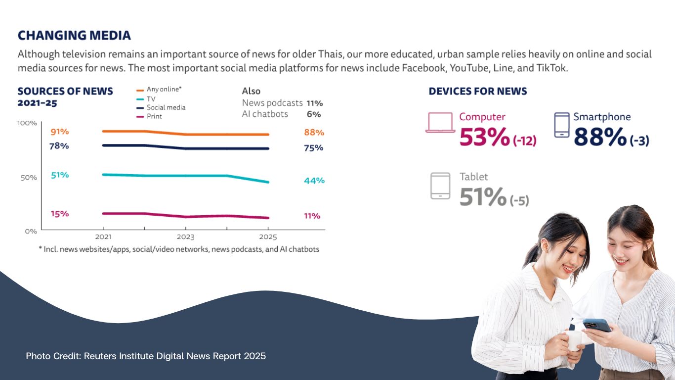 มีผู้ที่เลือกรับข่าวสารผ่านช่องทางออนไลน์สูงถึง 88% และใช้สมาร์ตโฟนเป็นอุปกรณ์หลัก ในขณะที่การรับชมข่าวผ่านหน้าจอทีวีลดลงเหลือเพียง 44%"