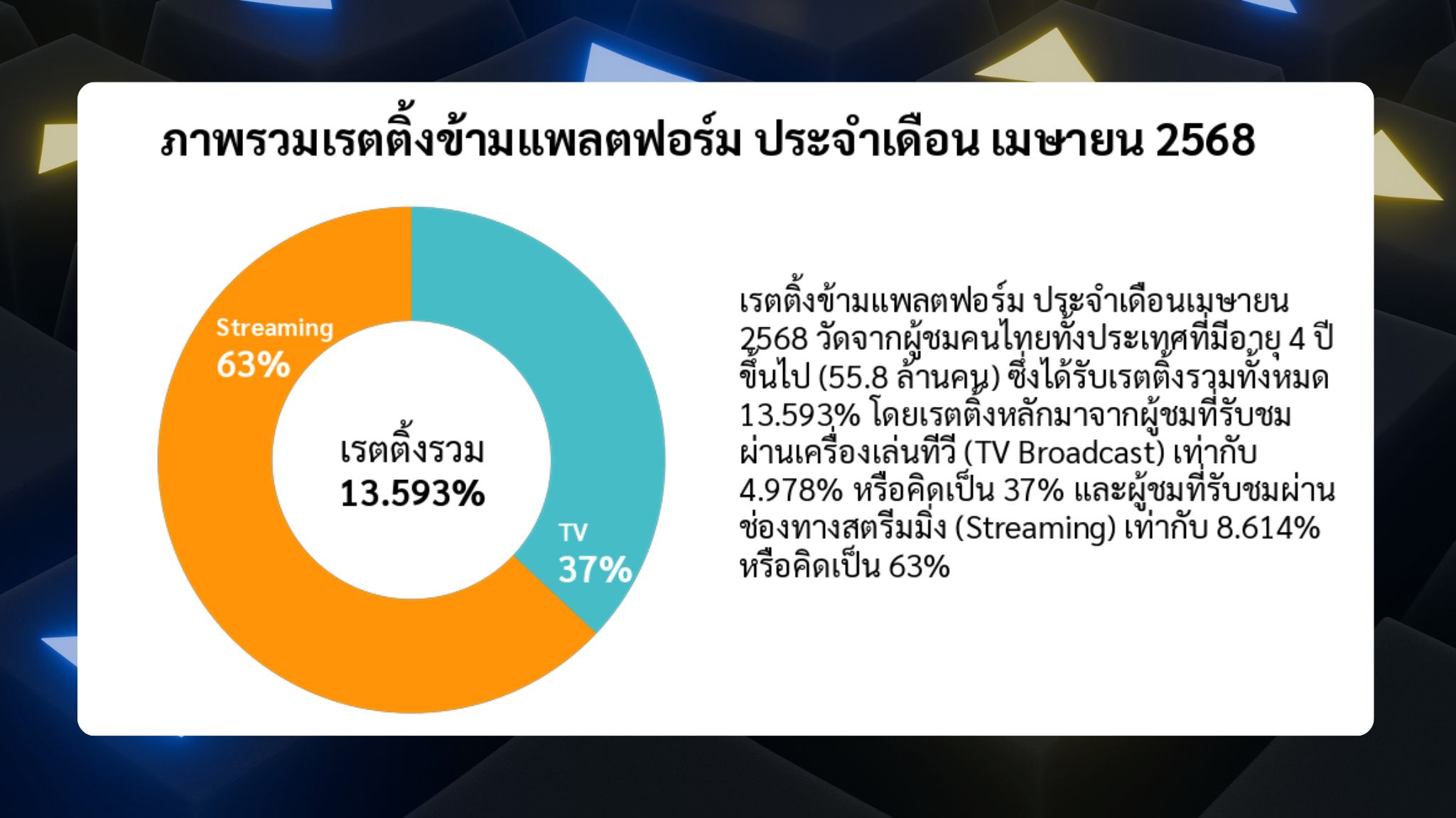 ตัวอย่างเช่น ภาพรวมเรตติ้งข้ามแพลตฟอร์ม ประจำเดือน เมษายน 2568 ซึ่งเป็นเดือนสุดท้ายที่ Nielsen ใช้วิธีวัดเรตติ้งแบบเดิม พบว่า สัดส่วนเรตติ้งหลักที่มาจากผู้ชมที่รับชมผ่านเครื่องเล่นทีวี (TV Broadcast) อยู่ที่ 37% ส่วนช่องทางสตรีมมิ่งอยู่ที่ 63% โดยแพลตฟอร์มสตรีมมิ่งที่คนใช้ดูรายการทีวีมากที่สุดคือ YouTube สะท้อนเทรนด์ในปัจจุบันชัดเจนว่าคนดูทีวีผ่านช่องทางสตรีมมิ่ง มากกว่าดูผ่านเครื่องเล่นทีวี
