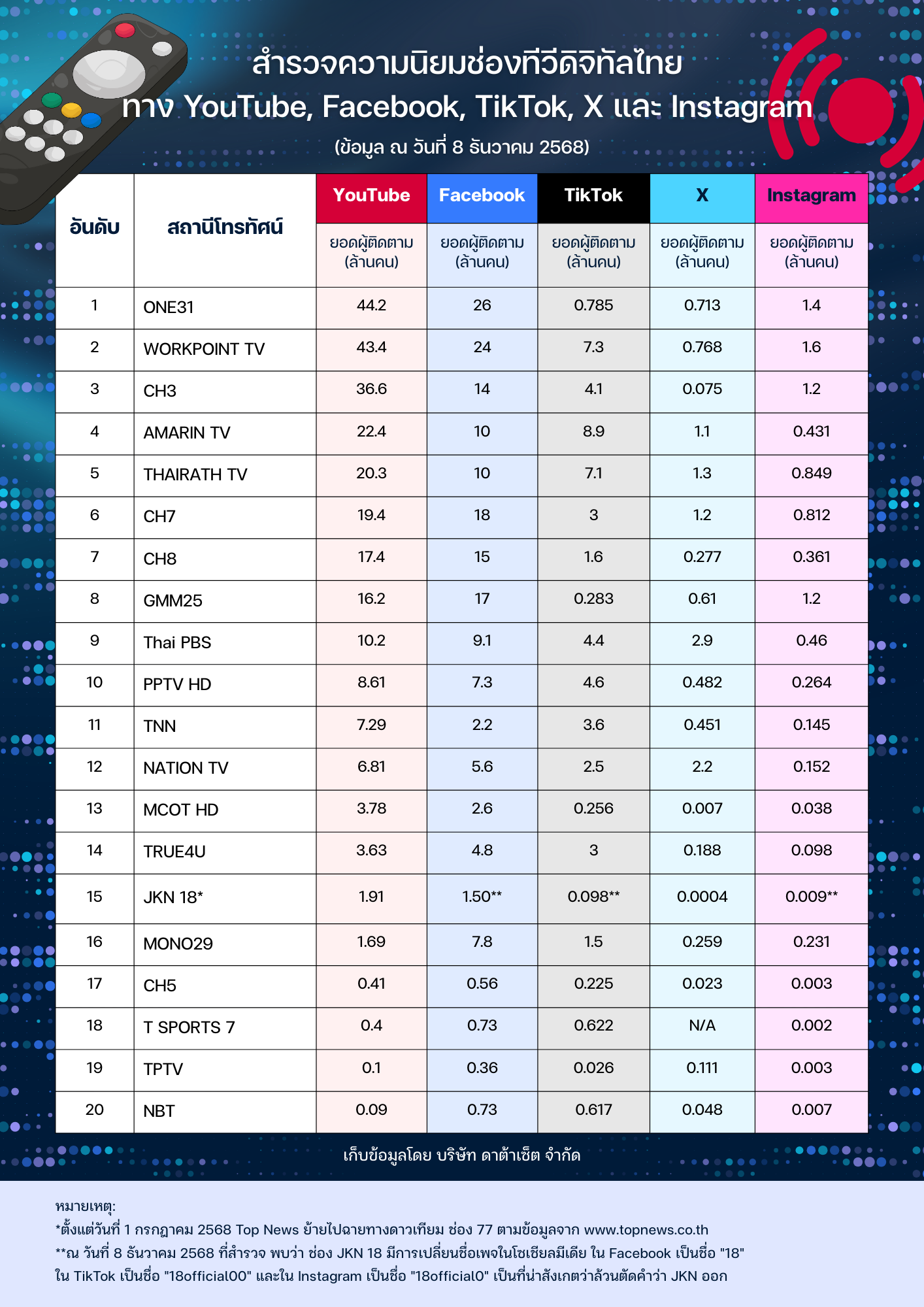 - ช่องที่มียอดผู้ติดตามทาง Facebook สูงสุด: ONE31 (26 ล้านคน)
