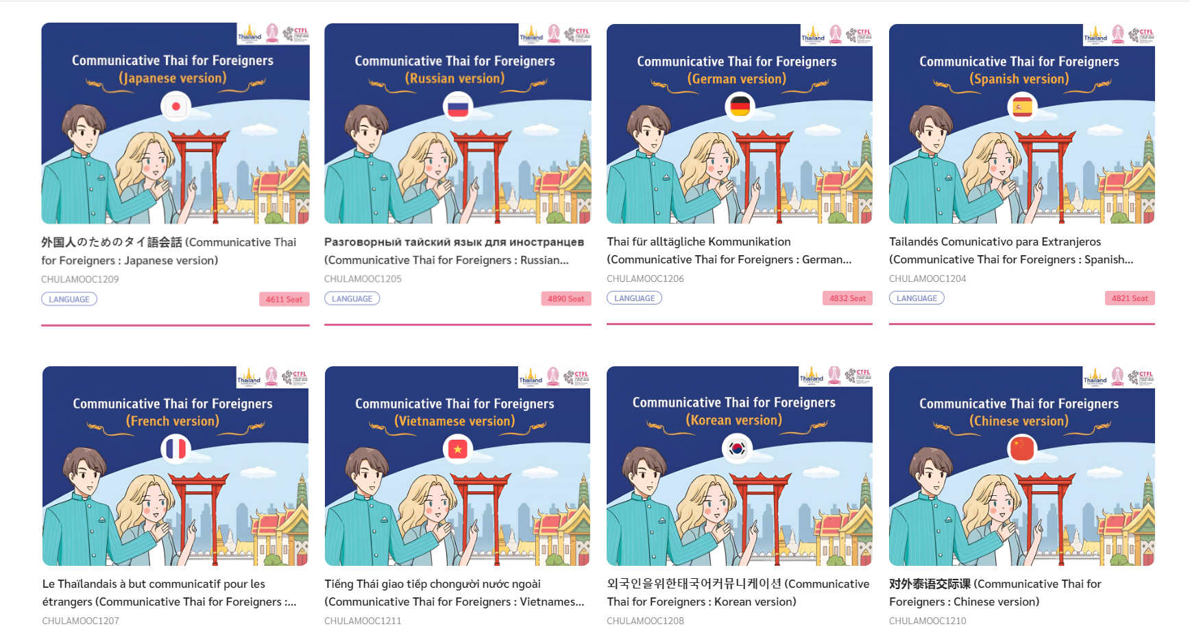 - หลักสูตรออนไลน์เรียนฟรี กับ Chula MOOC เตรียมตัวก่อนมาประเทศไทยด้วยหลักสูตรภาษาไทยพื้นฐานที่น่าสนใจ ได้แก่ หลักสูตร Survival Thai หลักสูตร Communicative Thai for Foreigners และหลักสูตร Thai on Campus พร้อมรับประกาศนียบัตรจากจุฬาฯ เมื่อเรียนจบหลักสูตร