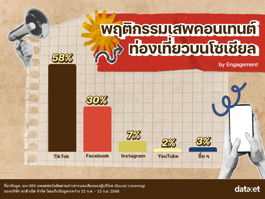 คอนเทนต์แบบ Short-form video ยังคงครองใจสายเที่ยวมากที่สุด โดยเฉพาะกลุ่มคนรุ่นใหม่ที่ชื่นชอบความรวดเร็ว สนุกสนาน และไอเดียใหม่ ๆ ในการท่องเที่ยว TikTok จึงกลายเป็นแพลตฟอร์มที่มีเอ็นเกจเมนต์สูงสุดสำหรับแรงบันดาลใจและคอนเทนต์ท่องเที่ยวแบบกระชับ