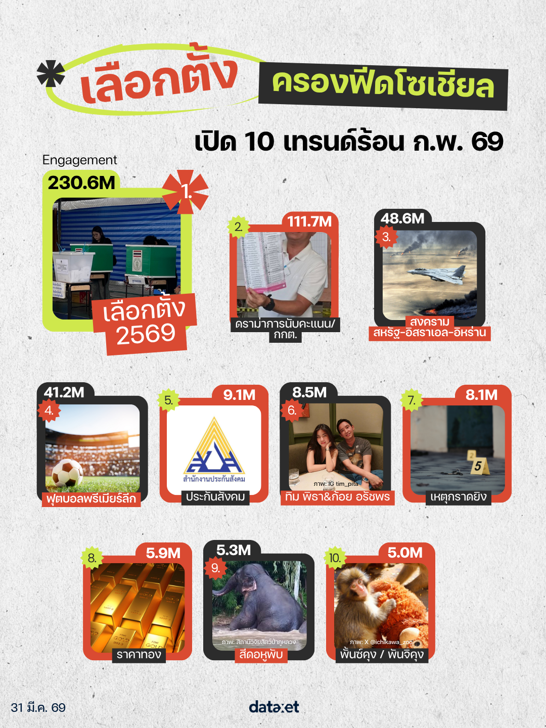 จากข้อมูล Social Listening ตลอดช่วงวันที่ 1–28 ก.พ. 2569 ดาต้าเซ็ตได้รวบรวมกระแสบนแพลตฟอร์มหลัก ทั้ง Facebook, TikTok, Instagram, X (Twitter) และ YouTube เพื่อสรุปเป็น 10 เทรนด์ที่มาแรงและมี Engagement สูงที่สุดประจำเดือนนี้ มีอะไรบ้าง ?